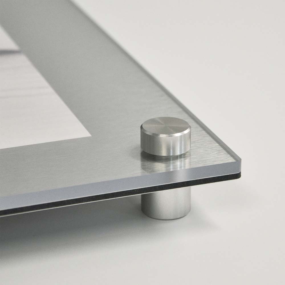 - A brushed aluminum composite panel with a solid polymer center, covered by a beautifully finished, frame-grade acrylic front